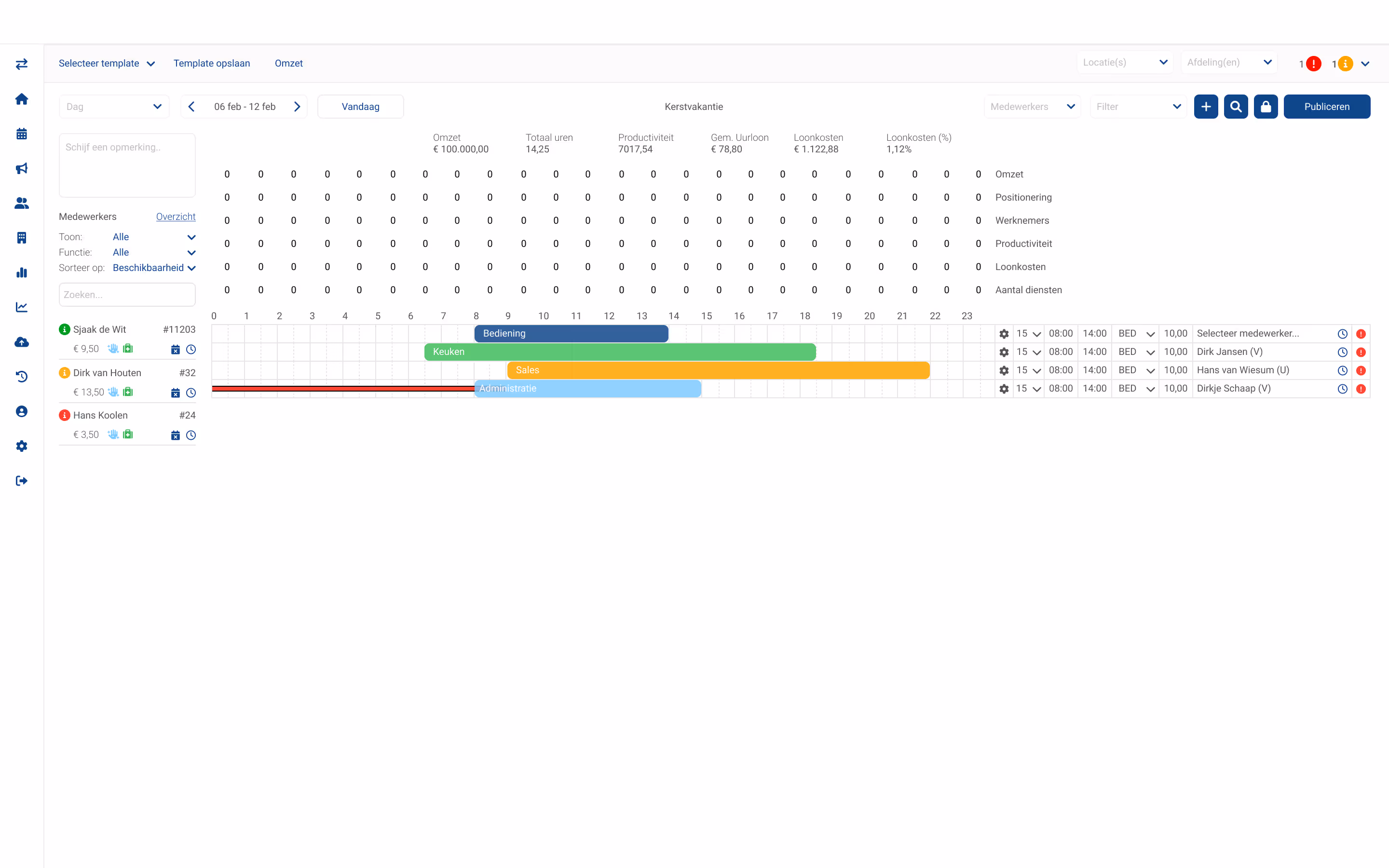 Plan slim in met een flexibele pool van oproepkrachten. Gebruik weerdata en historische omzet om altijd de perfecte balans te vinden tussen wijk-lopers, barpersoneel en de keukenbrigade, zonder onnodige loonkosten bij slecht weer.